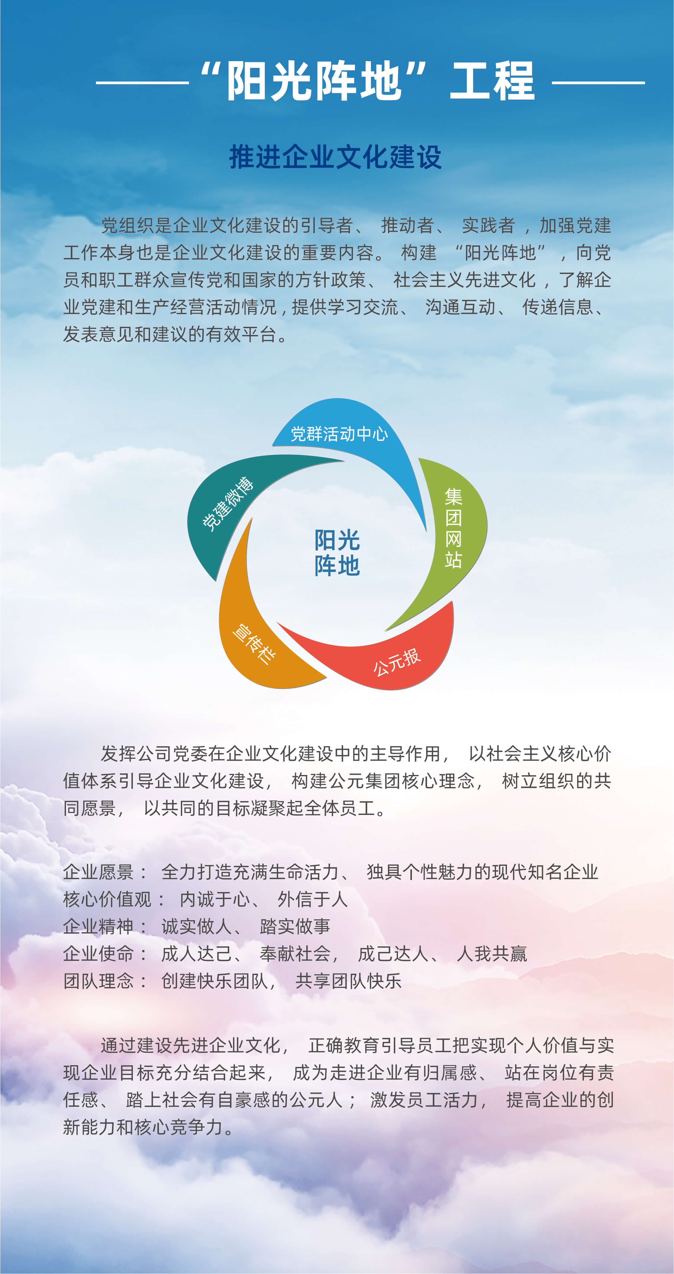 “阳光”蕴含无私、贡献、公正、透明、真诚、热情和环保等延伸元素。“阳光精神”是企业首创人张建均先生提倡并亲自垂范的企业精神,公司全体治理者作风和修养、宽大员工精神品质的集中体现;是公司企业文化建设的焦点内在;也与集团公司的太阳能和绿色建材工业相关联。