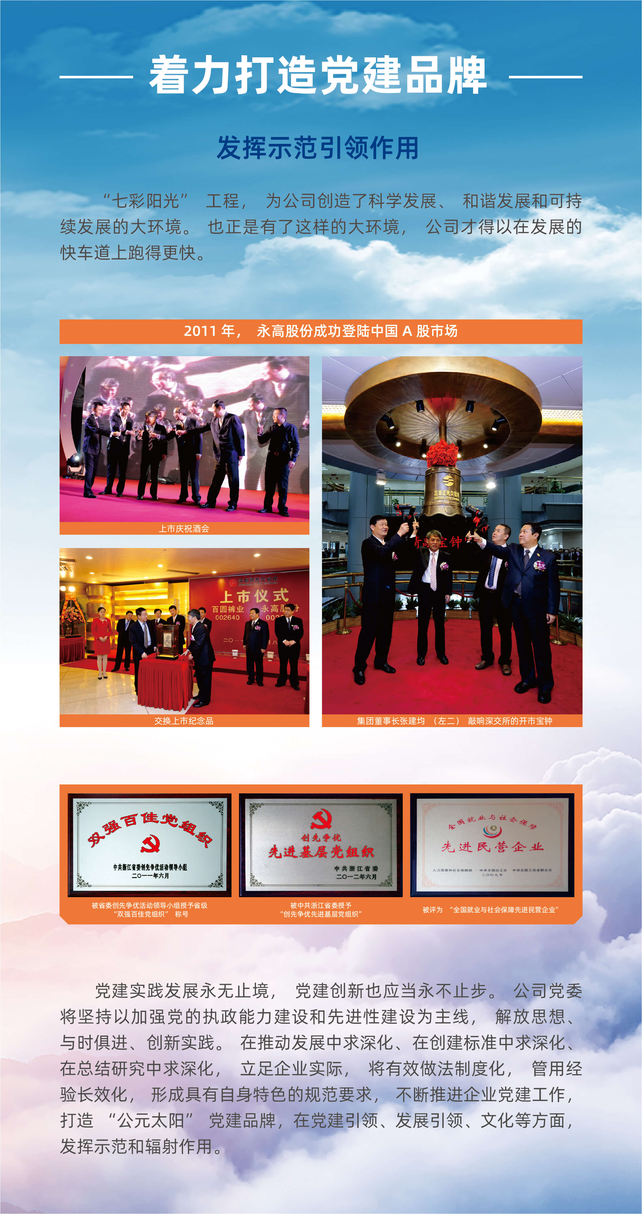 公司自建设之初,首创人张建均先生始终坚持党的向导,十分重视企业文化和文明建设事情,着力提升企业文明水平和员工文明素养。经由近30多年的沉淀、积累和生长,已经形成了独具永高特色的党建和企业文化系统,在天下行业领域和省市区施展了起劲的树模作用和品牌效应。